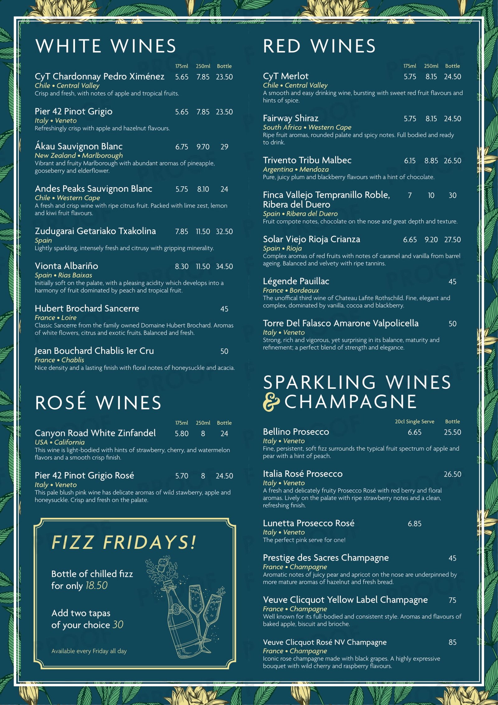 Our selection ranges from easy-drinking, great-value favourites to premium bottles sourced from renowned regions across France, Italy, and Spain. Whether you’re after a crisp, refreshing white, a bold and comforting red, or something sparkling for a celebration, you’ll find a glass — or a bottle — that hits the spot.